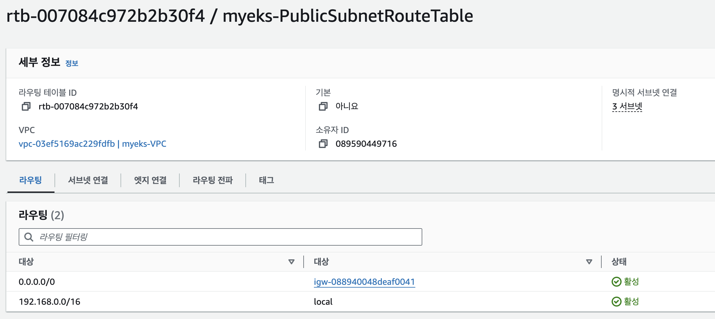 퍼블릭 서브넷 라우팅 테이블에는 인터넷 게이트웨이와 연결이 되어있어 192.168.0.0/16 대역이 아닌 경우 외부로 통신하게 됩니다.