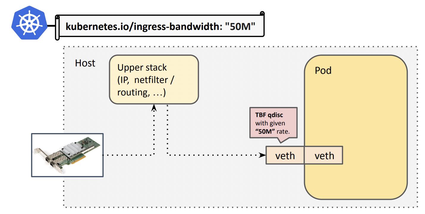 예를 들어, ingress 트래픽 제어 설정인 kubernetes.io/ingress-bandwidth="50M"의 경우 veth의 TBF qdisc에 설정됩니다.