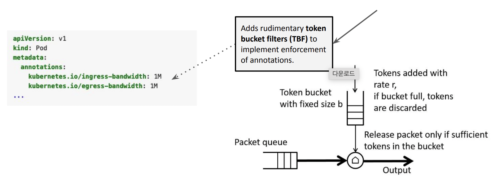 하지만 이 기능은 bandwidth meta plugin에서만 지원하며, 내부적으로 토큰 버킷 필터(Token Bucket Filter, TBF) 를 사용합니다.