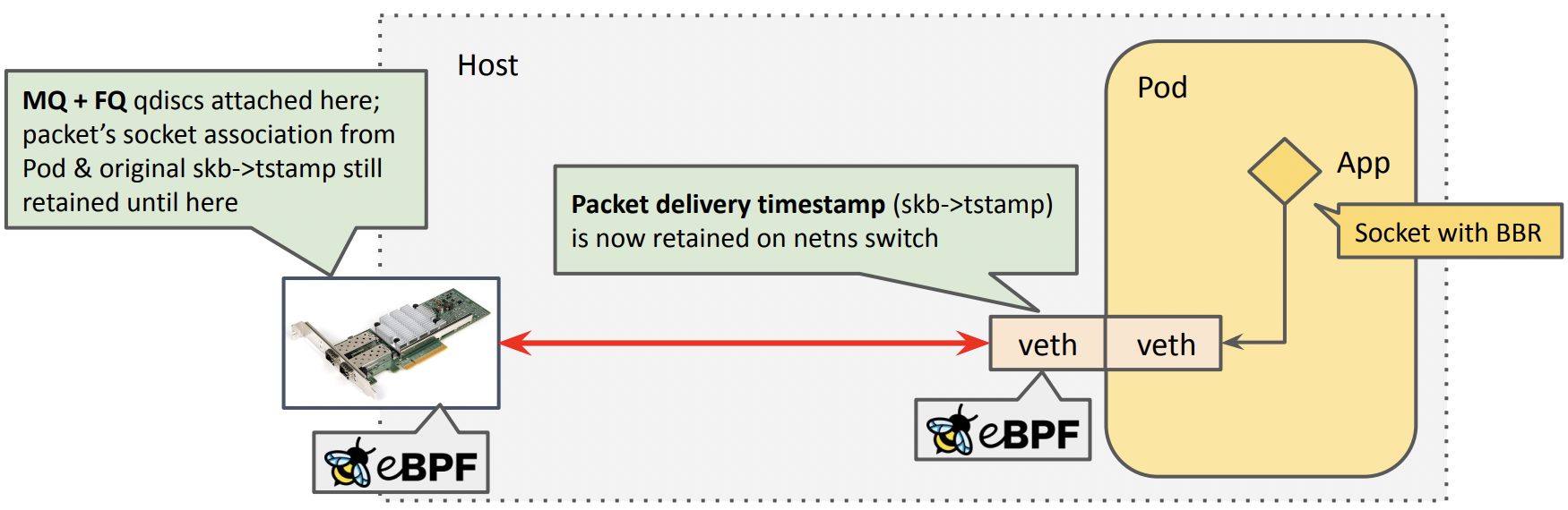 그래서 Cilium 팀은 Facebook과 함께 이 문제를 해결해, 네임스페이스를 거쳐도 송신 타임스탬프가 유지되도록 커널을 수정했습니다. 이제 이 SKB에 타임스탬프 값이 지워지지 않다보니 Cilium Bandwidth Manager 과 결합되어 쿠버네티스에서도 BBR 알고리즘이 잘 동작하게 됩니다.