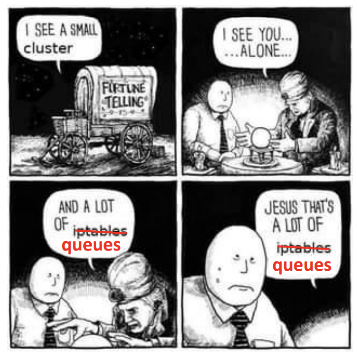 그리고 이 TBF는 단일 큐로 되어있습니다. 아래 그림에서 처럼 여러 클라이언트들로부터 들어오는 패킷이 하나의 TBF 큐로 가는것을 볼 수 있습니다. 이렇다보 인그레스에서 여러 CPU가 동시에 트래픽을 받을 경우, 모든 패킷이 하나의 TBF 락(lock)에 걸려 병목이 발생합니다. 이는 물리 NIC의 멀티큐 성능을 망가뜨립니다. 또, 수신측에서 큐잉이 발생하면, 이미 네트워크 대역을 소비한 후 노드에서 패킷을 버리는 ‘버퍼블로트(bufferbloat)’ 문제가 생깁니다.
