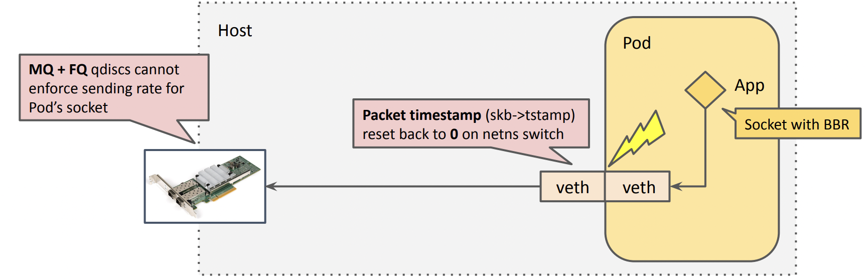 Cilium에서 BBR을 쓰려 했지만, 기존 리눅스 커널은 veth로 네트워크 네임스페이스를 넘을 때 패킷 타임스탬프를 0으로 초기화해 BBR이 제대로 동작하지 않는 문제가 있었습니다. BBR은 언제 패킷을 보낼지(페이싱)를 정하는 타임스탬프가 매우 중요한데, 네임스페이스를 지나는 과정에서 커널이 그 값을 지워버렸기 때문입니다.