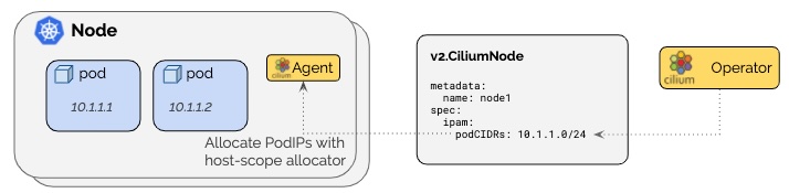Kubernetes Host Scope 모드는 쿠버네티스 노드에 설정된 파드 대역을 보고 agent가 파드 대역을 설정하는 모드입니다.