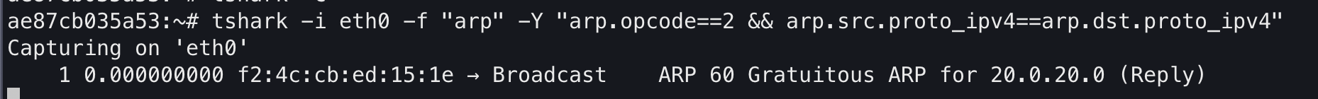 tshark -i eth0 -f "arp" -Y "arp.opcode==2 && arp.src.proto_ipv4==arp.dst.proto_ipv4"