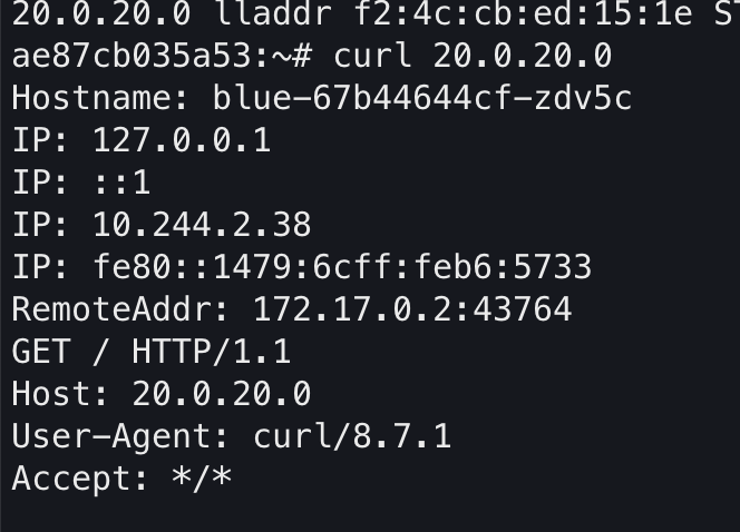 이 맥 주소가 kind-worker2인지도 확인해보겠습니다. 디버깅 명령어로 확인했을 때 Selected가 true인 것만 l2 announce 로 사용가능하며 현재 kind-worker2의 eth0인터페이스의 맥 주소와 실제 응답 준 맥주소가 동일한 것을 확인할 수 있습니다.