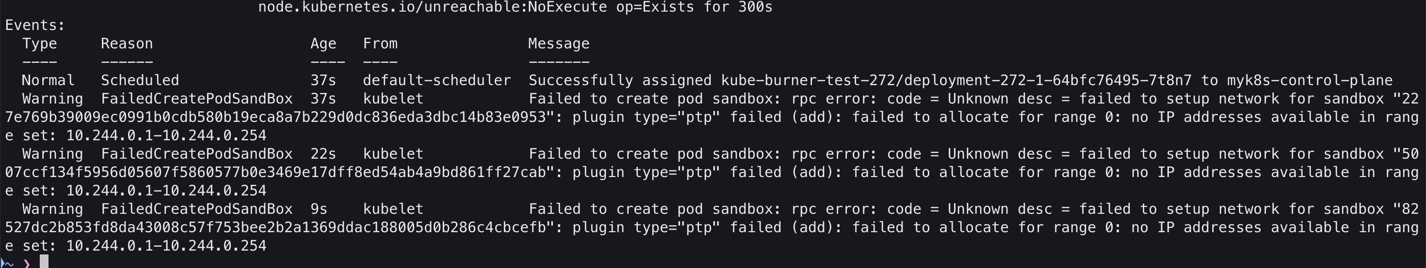 뜨지 않고 있는 파드를 하나 잡아 확인해보니 다음과 같이 노드의 아이피가 고갈되어 파드에 아이피를 할당할 수 없어 파드를 생성할 수 없다는 에러가 보입니다.