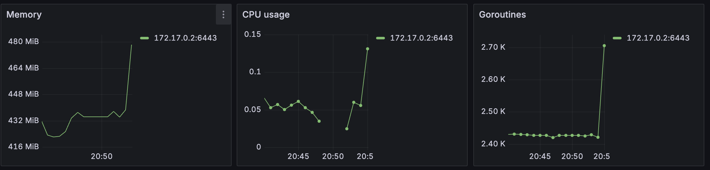 수행해보니 급격하게 API서버의 메트릭 상태를 확인했을 때 급격하게 goroutine의 갯수와 메모리, CPU의 사용량이 증가한 것을 확인할 수 있었습니다.