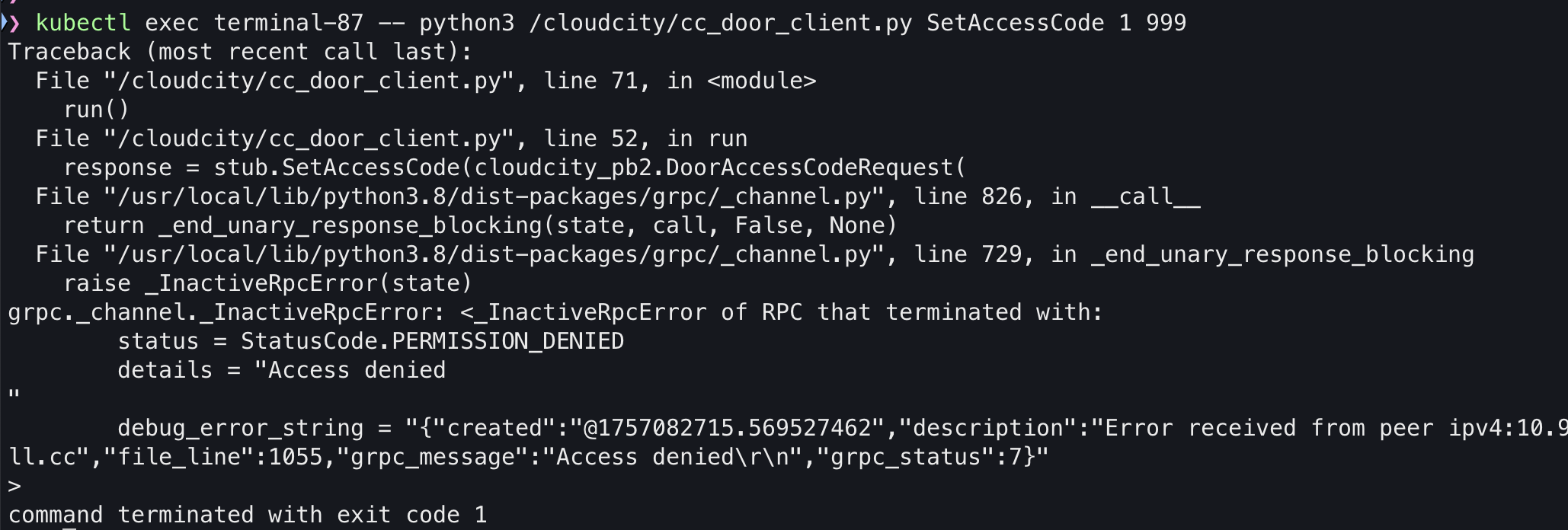 kubectl exec terminal-87 -- python3 /cloudcity/cc_door_client.py SetAccessCode 1 999