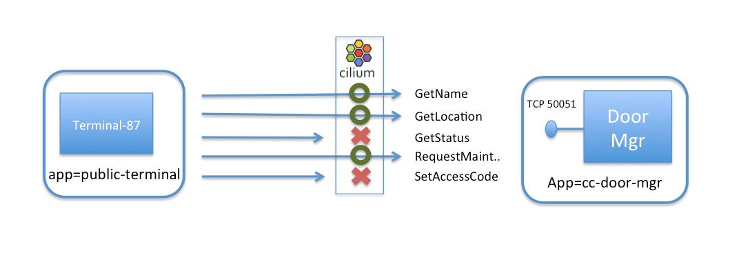 이 정보를 이용하여 Cilium의 HTTP 인지형 필터를 적용해 공용 터미널이 Door 서비스의 전체 gRPC 메서드 중 일부만 호출할 수 있도록 제한하면 됩니다.