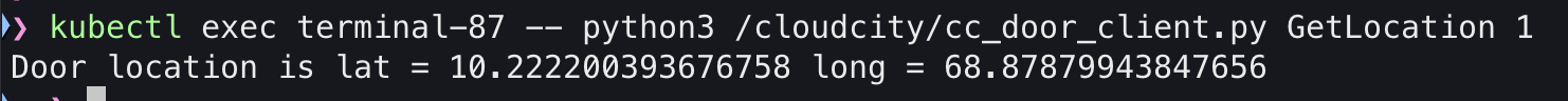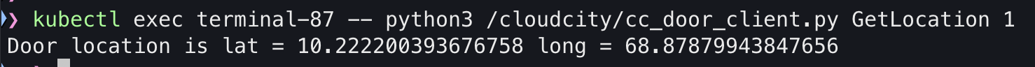 kubectl exec terminal-87 -- python3 /cloudcity/cc_door_client.py GetLocation 1