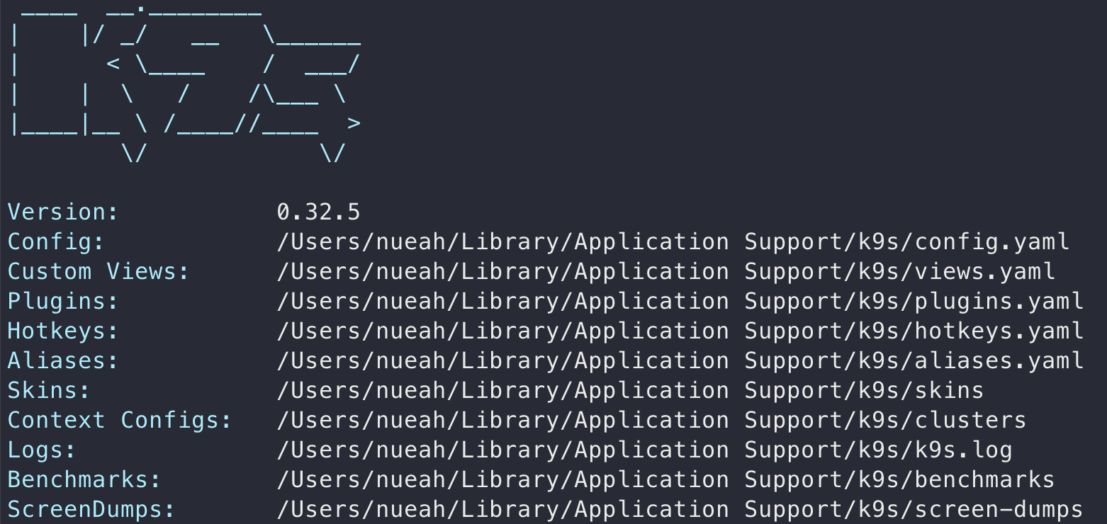 $XDG_CONFIG_HOME/k9s/skins 여기 아래에 스킨을 넣으면 되는데 여기가 설정이 안되어있으면 k9s info로 스킨 폴더 정보를 확인할 수 있다.