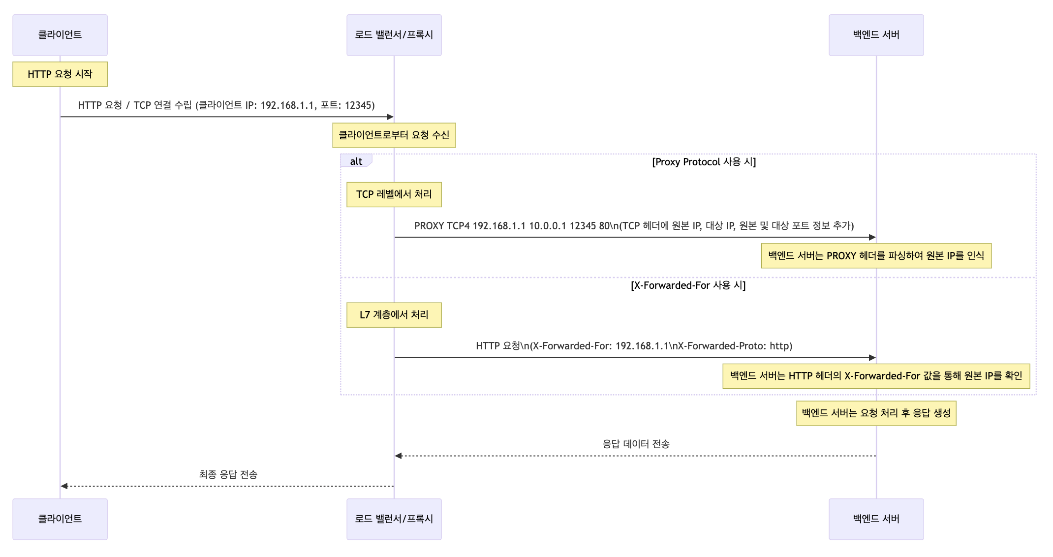 Proxy Protocol과 X-Forwarded-For 헤더는 모두 클라이언트의 원래 IP 정보를 백엔드 서버에 전달하기 위한 목적으로 사용되지만, 그 동작 방식과 적용 범위에서 차이점이 있다.