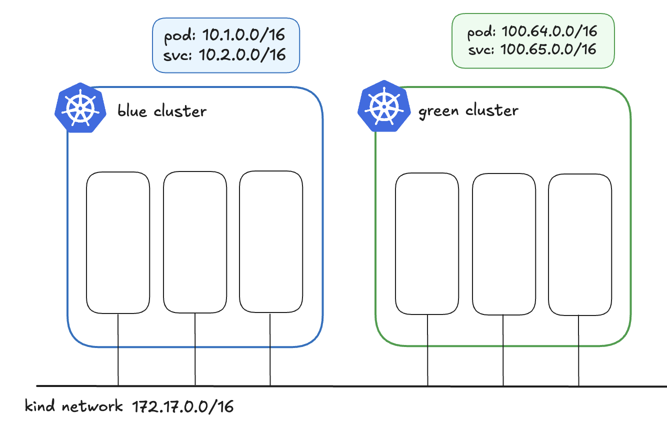 이번 테스트에서는 meshID는 color로 클러스터의 이름은 kind-<color> 그리고 network의 이름은 각 컬러의 이름으로 지정해서 생성해보려고 합니다.