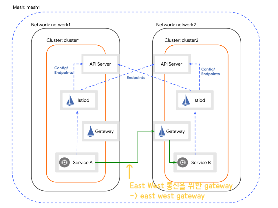 - istiod → 다른 네트워크에 있는 클러스터의 api 서버 (반대의 경우도 동일)
