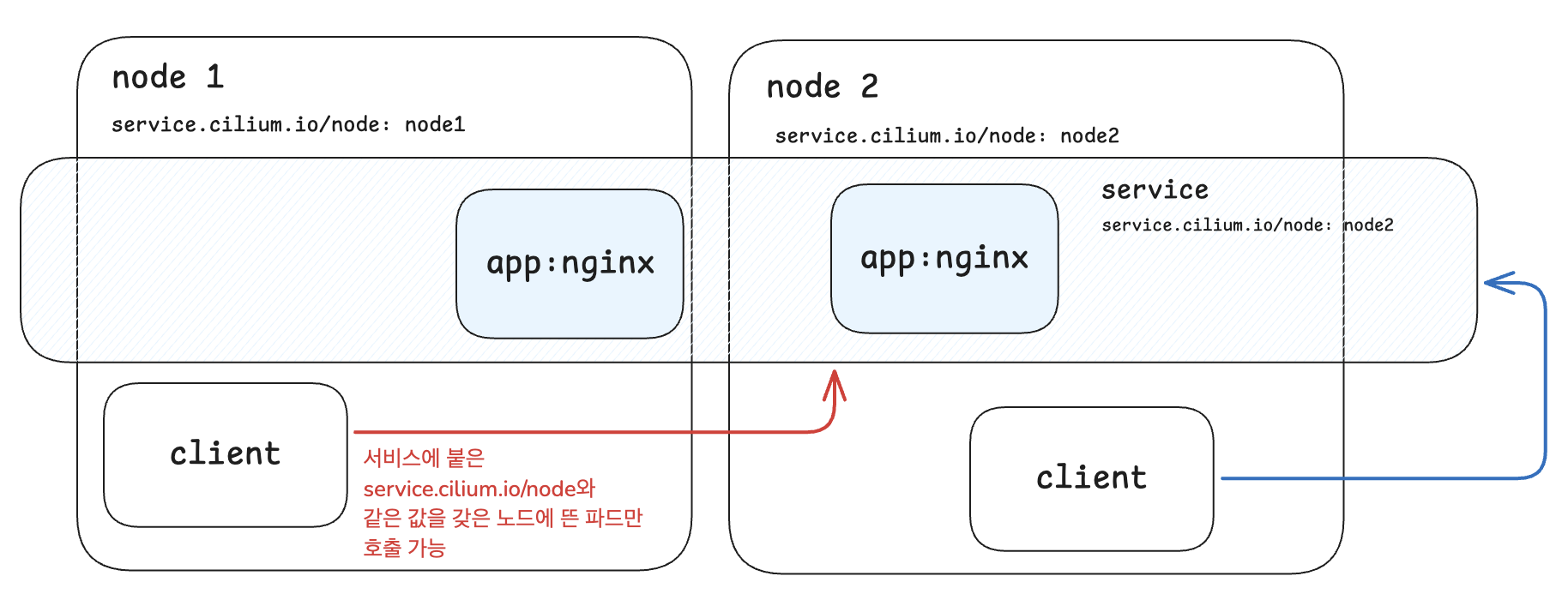 아래의 그림에서 처럼 서비스의 annotations에 정의되어있는 service.cilium.io/node의 값과 같은 값을 갖고 있는 노드에서만 해당 서비스로 호출이 가능합니다. 서비스가 아닌 파드아이피로 직접 호출할 때에는 어디에서든지 통신이 가능합니다.