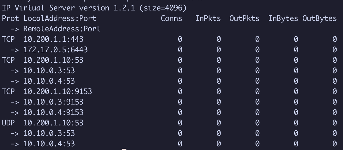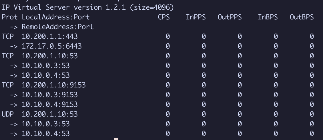 이 출력은 IP Virtual Server(IPVS)에서 관리하는 연결과 네트워크 성능 정보를 보여줍니다. Prot는 사용 중인 프로토콜(TCP 또는 UDP)을 나타내며, LocalAddress는 가상 서버(로드 밸런서)의 IP 주소와 포트를 나타냅니다. CPS는 초당 생성된 연결 수를 의미하며, InPPS와 OutPPS는 각각 초당 수신된 패킷과 전송된 패킷 수를 나타냅니다. InBPS와 OutBPS는 초당 수신 및 전송된 데이터의 바이트 수를 나타내며, 이를 통해 실시간 네트워크 트래픽과 성능을 모니터링할 수 있습니다. 마지막으로, RemoteAddress는 백엔드 서버의 IP 주소와 포트를 나타내며, 로드 밸런서가 트래픽을 전달하는 대상 서버입니다.