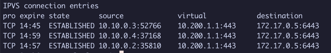 첫 번째 연결: 클라이언트 IP 10.10.0.3의 포트 52766에서 로드 밸런서 IP 10.200.1.1의 포트 443으로 연결되었으며, 해당 요청은 백엔드 서버 IP 172.17.0.5의 포트 6443으로 전달되었습니다. 이 연결은 현재 ESTABLISHED 상태로, 남은 만료 시간은 14분 45초입니다.