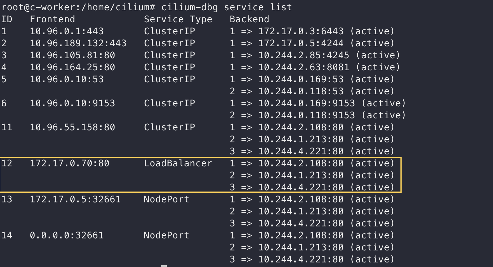 Cilium 노드 (cilium daemonsets)에서 IP 연결 상태를 확인할 수 있습니다. cilium-dbg 명령어를 사용하면 LoadBalancer와 연결된 각 IP들의 리스트를 볼 수 있습니다.