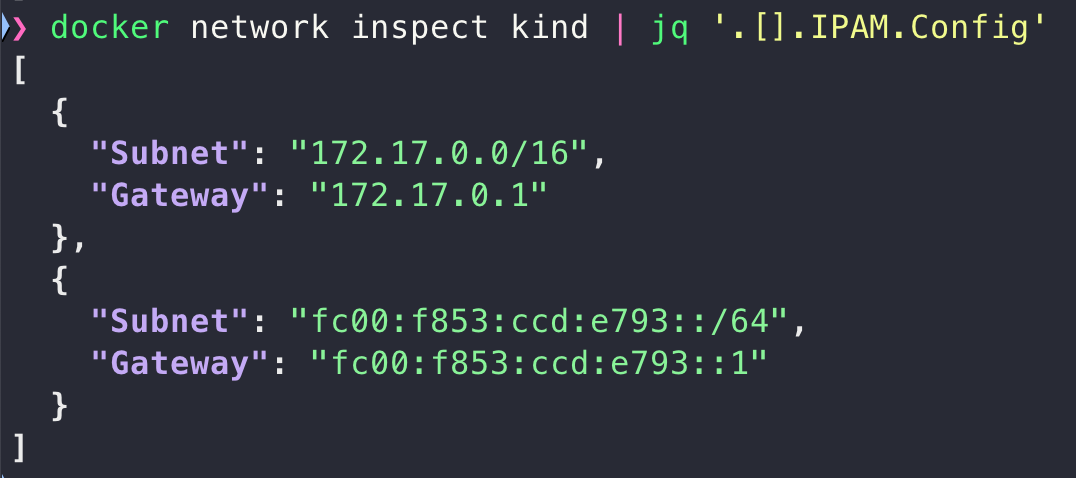 특별한 설정을 하지 않으면 기본적으로 Kind는 자체 네트워크 대역을 사용합니다. Kind가 사용하는 네트워크 대역을 확인하려면 다음 명령어를 실행합니다.