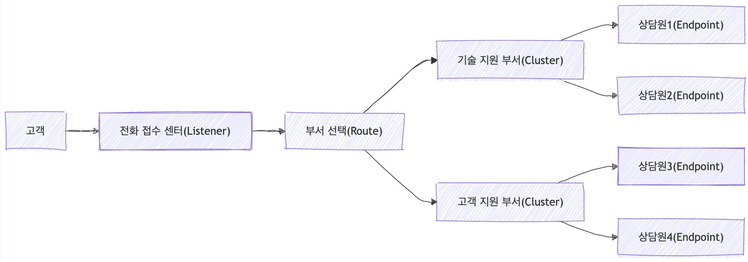 envoy의 룰을 살펴보다 보면 Listener, Route, Cluster, Endpoint이란 용어를 마주하게 됩니다. 각각의 용어를 쉽게 이해하기 위해서 고객이 콜센터에 전화하여 상담원을 만나기까지의 과정을 함께 표현해보았습니다.