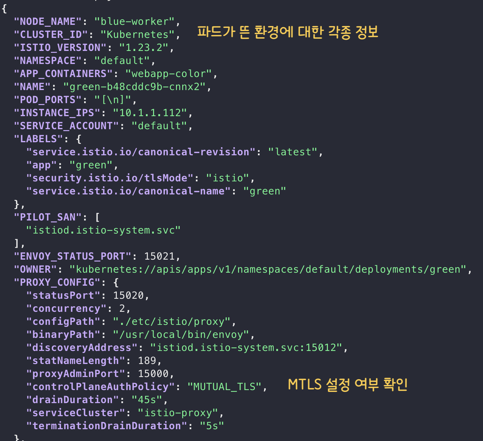 파드에 Istio-proxy(Envoy)를 추가한 후, Envoy의 설정 정보를 확인할 수 있습니다. 이 설정 정보는 트래픽 라우팅과 네트워크 통신의 세부적인 룰을 담고 있습니다.