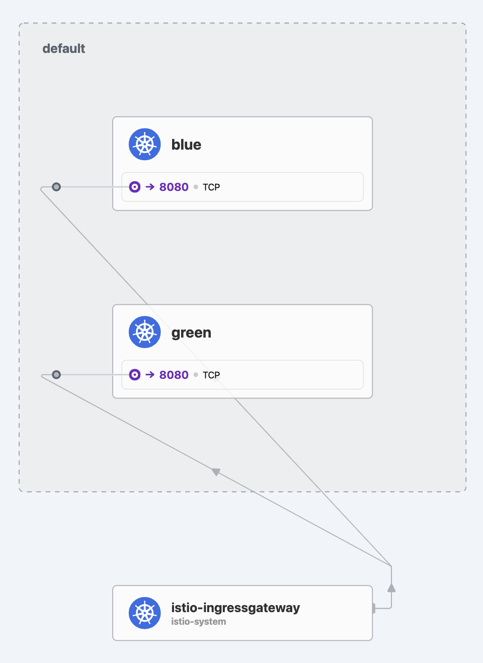 Gateway는 외부에서 Istio 메쉬로 들어오는 트래픽의 진입점을 정의합니다. selector를 통해 어떤 ingress gateway를 통해 트래픽을 보낼지 설정할 수 있습니다. 기본으로 구성한 ingress gateway에는 istio=ingressgateway 라벨이 붙어있기 때문에 다음과 같이 설정하였습니다. 또한 모든 도메인에 대해 트래픽을 수락하도록 host를 *로 설정하였습니다.