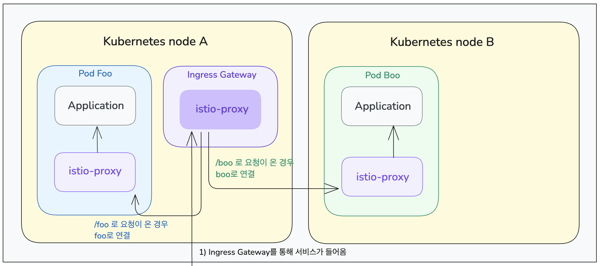 최신 Istio 버전에서는 Gateway API가 표준이 될 가능성이 높지만, Istio에서 제공하는 모든 기능을 Gateway API를 담을 수 없기 때문에 아직까지는 기존 리소스를 사용하는 것이 더 안정적입니다. 테스트에서는 Gateway와 VirtualService를 이용해 URI 경로별로 트래픽을 라우팅해보겠습니다.
