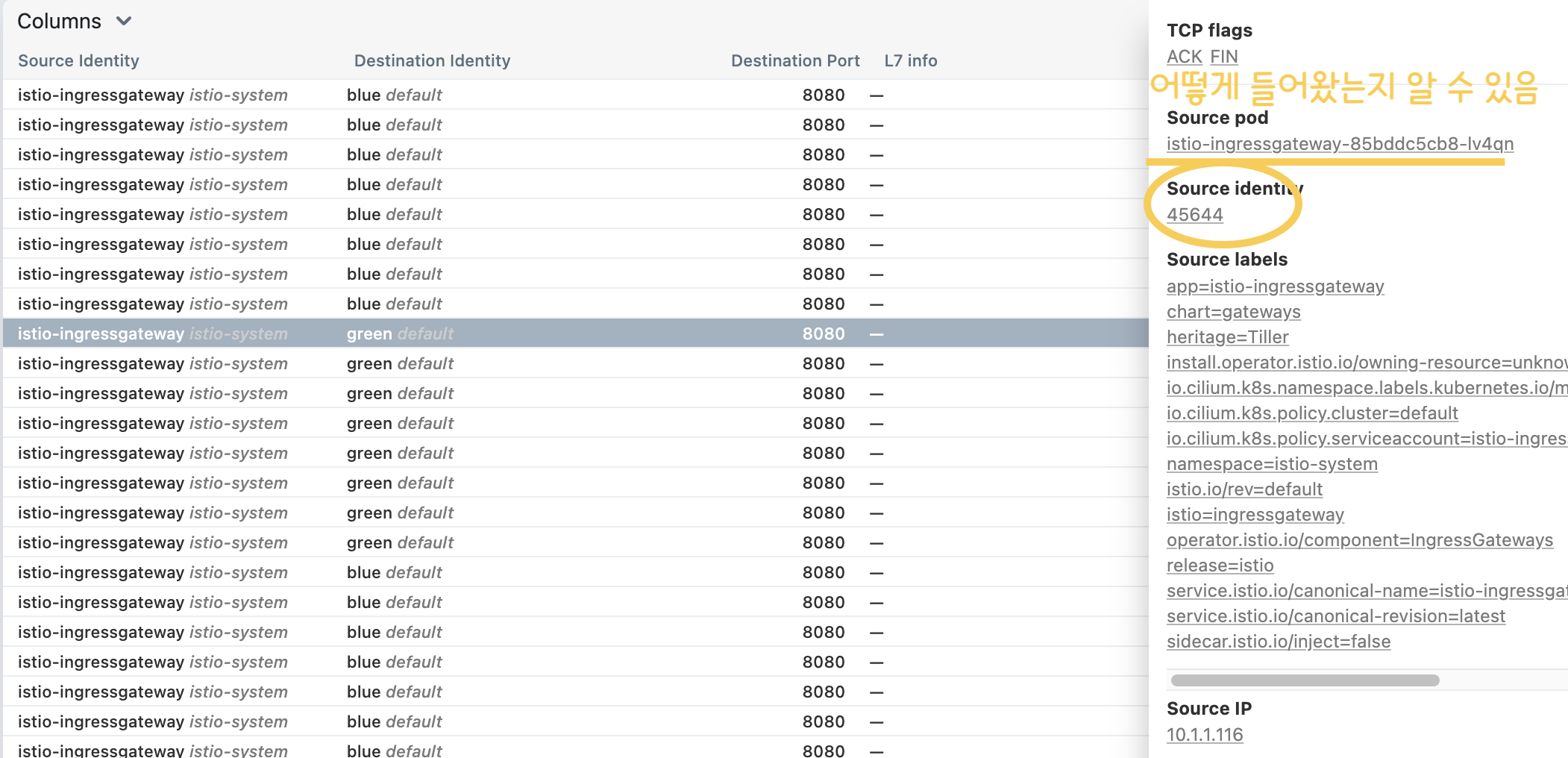 Hubble을 사용하면 Istio의 트래픽 흐름을 실시간으로 모니터링할 수 있습니다. Ingress Gateway에서 blue와 green으로 라우팅되는 트래픽을 확인할 수 있으며, 로그에서 출발지 IP와 트래픽 흐름의 세부 사항도 확인할 수 있습니다.