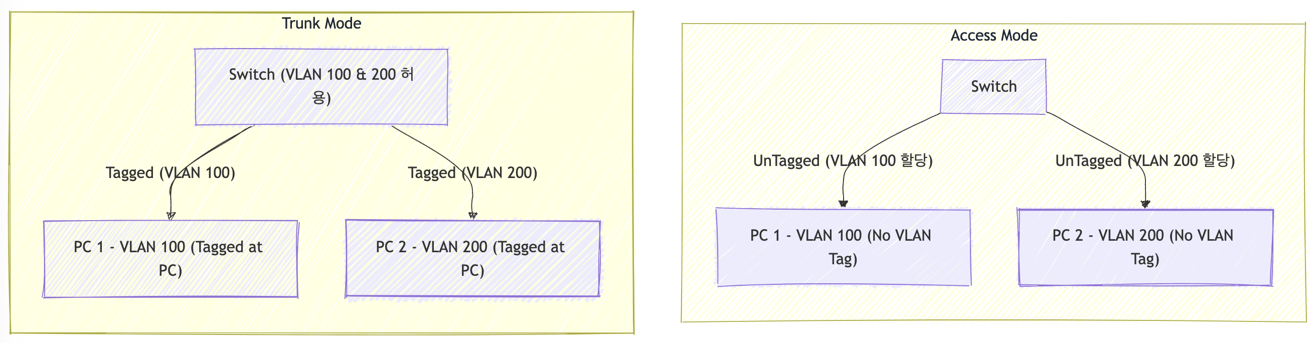 Access 모드는 한 포트가 하나의 VLAN에 속하며, 주로 단말 장치에 적용됩니다. 이 모드에서는 VLAN 태그 없이(UnTagged) 트래픽이 전달되며, 스위치가 각 포트에 VLAN을 할당하여 관리합니다. 단말 장치들은 VLAN 설정을 신경 쓸 필요가 없습니다.