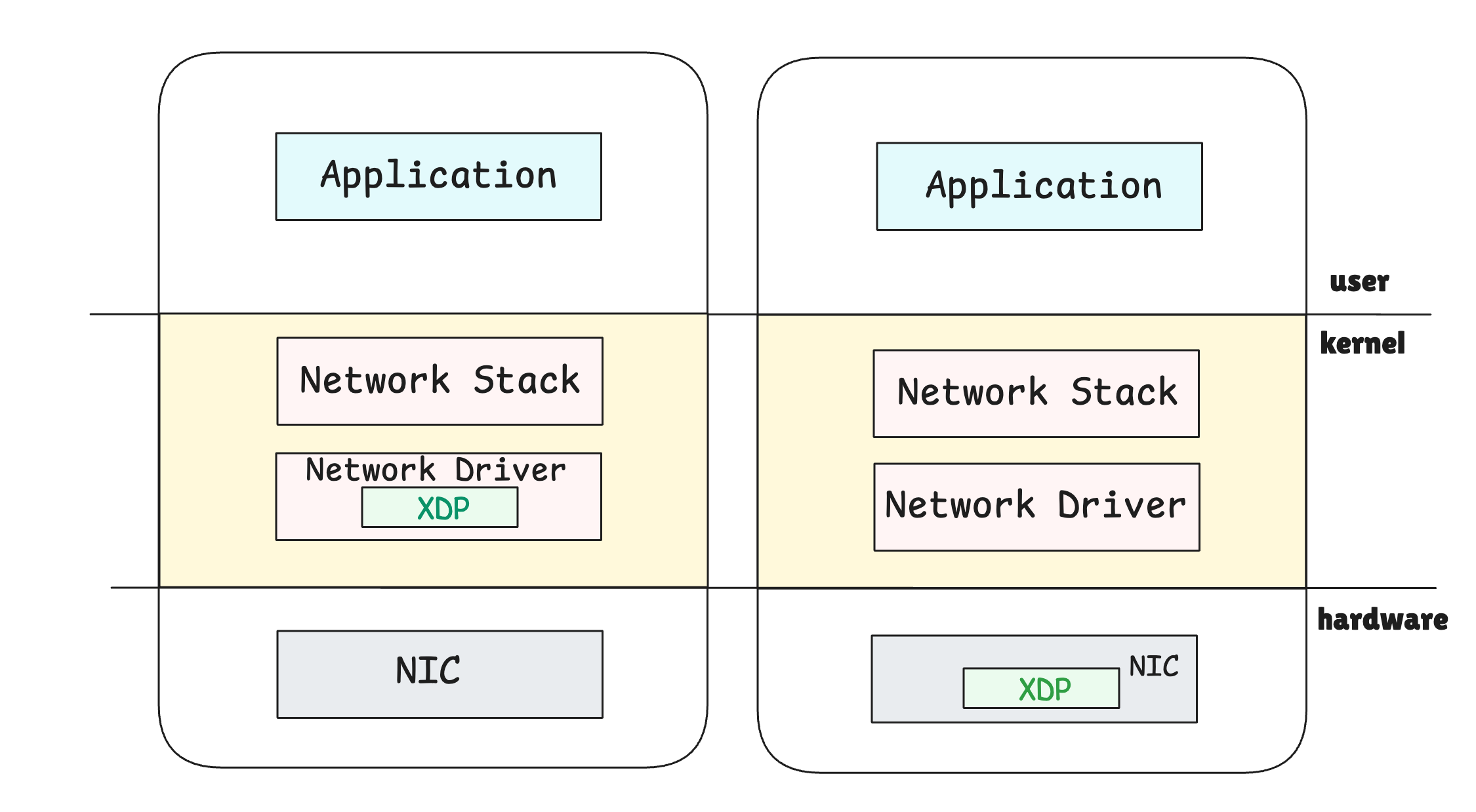 XDP(eXpress Data Path)는 네트워크 성능을 크게 향상시킬 수 있는 Linux 기능입니다. 네트워크 인터페이스 카드(NIC)가 패킷을 처리하기 전에, 즉 패킷이 운영체제의 네트워크 스택에 도달하기 전에 트래픽을 매우 빠르게 처리할 수 있습니다. 이로 인해 네트워크 성능이 크게 개선되며, 특히 고성능 네트워크 환경에서 매우 유용합니다.