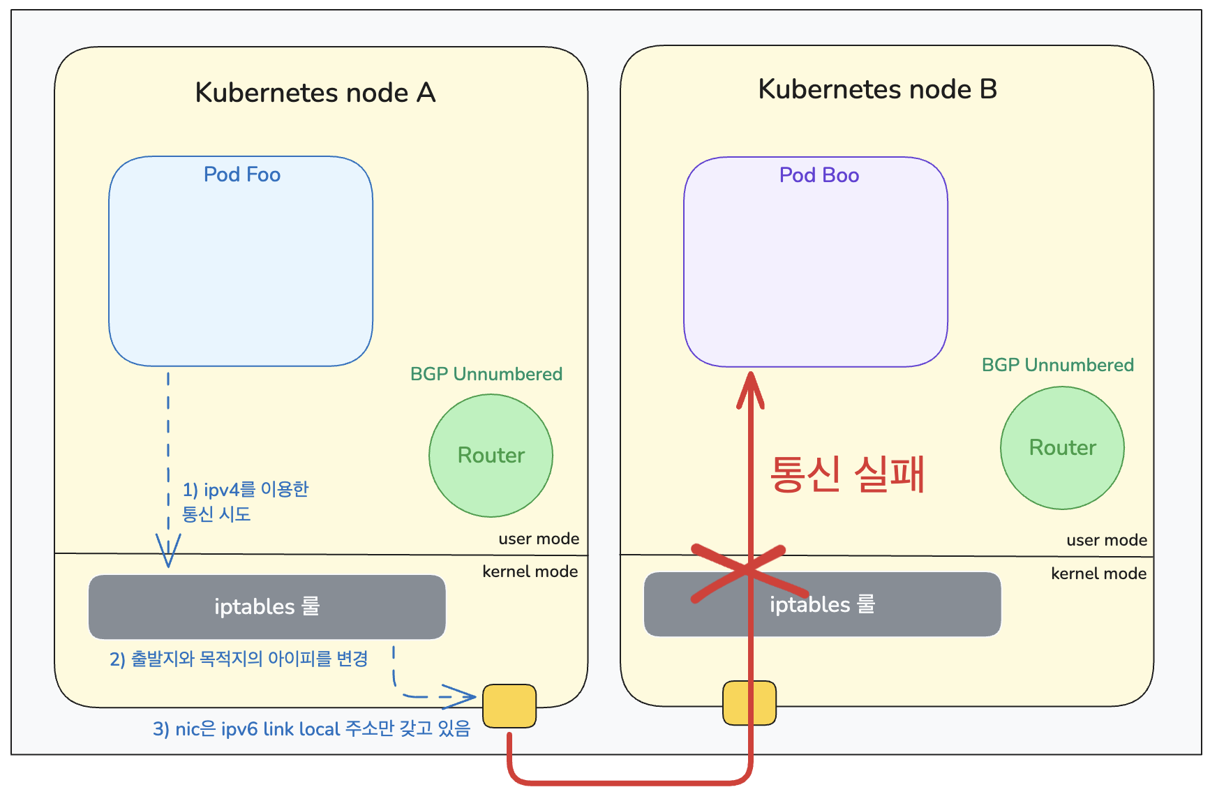 리눅스 호스트에서 Kubernetes를 운영하고 있으며, 이 호스트들은 BGP(Unnumbered) 방식으로 설정되어 자체적으로 라우터 역할을 수행하고 있습니다. BGP Unnumbered 설정이 적용되면서 각 호스트의 네트워크 인터페이스(NIC)는 IPv6 링크 로컬 주소만을 가지게 되며, IPv4 라우팅은 이 NIC들을 경유지(Next-hop)로 지정하는 방식으로 이루어집니다. 결과적으로 IPv4 트래픽이 IPv6 링크 로컬 주소를 통해 라우팅되도록 설정되어 있는 셈입니다.