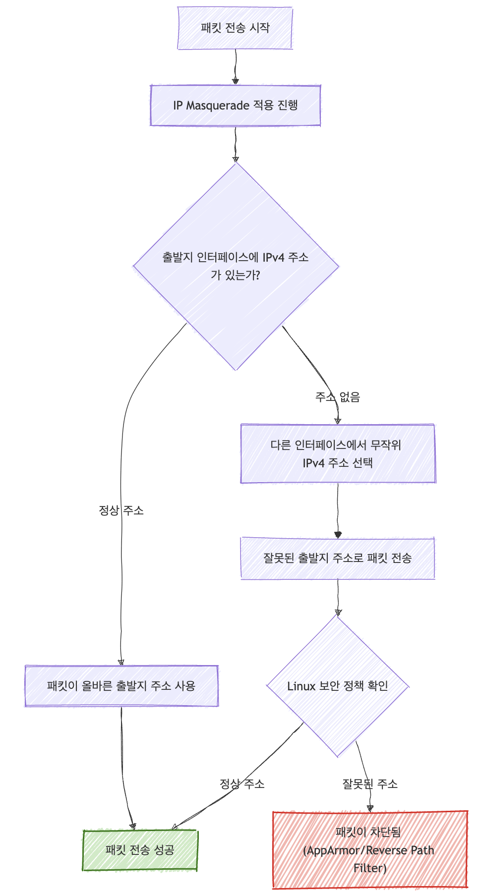 pwru로 패킷의 흐름을 다시 분석한 결과, IP 마스커레이드 과정에서 패킷의 소스 주소가 예상과 다르게 설정된 것이 문제라는 사실을 발견했습니다. Linux에서 IP 마스커레이드는 패킷이 나가는 경로에 따라 동적으로 출발지 주소를 선택하지만, 지정된 IPv4 주소가 없는 경우 다른 인터페이스에서 무작위로 주소를 선택해 사용할 수 있습니다. 이로 인해 패킷이 잘못된 소스 주소를 갖게 되고, Linux의 AppArmor 또는 리버스 패스 필터와 같은 보안 정책이 이를 차단하게 된 것입니다.